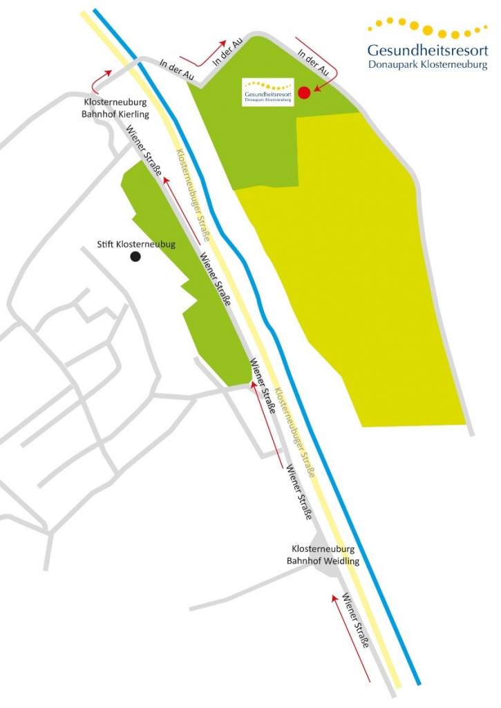 Von Wien (Heiligenstädter Straße) ab Stadtgrenze auf der Wiener Straße immer gerade in Richtung Stift Klosterneuburg, auf der Wiener Straße am Stift vorbei gerade weiter bis Bahnhof Klosterneuburg-Kierling (Niedermarkt), an der Kreuzung rechts unter der Unterführung hindurch, nach 50 Metern wieder rechts, Straße „In der Au“ folgen bis Einfahrt Gesundheitsresort Donaupark Klosterneuburg, In der Au 6.